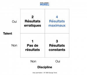 Quadrant 4 : Voici le tour de Stéphane, le jeune vendeur qui fait équipe seul dans une nouvelle division d’un géant informatique. Les autres vendeurs l’ignorent dans la cafétéria. Mâle alpha sympathique et humain, il est doué. Il a ce «quelque chose», mais seul son patron l’a vu en lui. Il devient un autodidacte hors-pair. Il lit tout. Il se débrouille avec des contacts du siège social de New York. Stéphane développe de nouveaux créneaux, prend des risques, des initiatives. Il courre 5 km chaque soir à 21h et prépare le petit déjeuner à ses deux enfants chaque matin. Il est discipliné. Il obtient des résultats. On le remarque, il est promu. Puis promu de nouveau. En moins de deux, il devient le vice-président, secteur commercial et industriel, pour IBM Québec – et de ceux qui le boudaient, qui gère 1,1 milliards de dollars de ventes annuelles. Un exemple probant du quatrième quadrant : du talent et de la discipline.